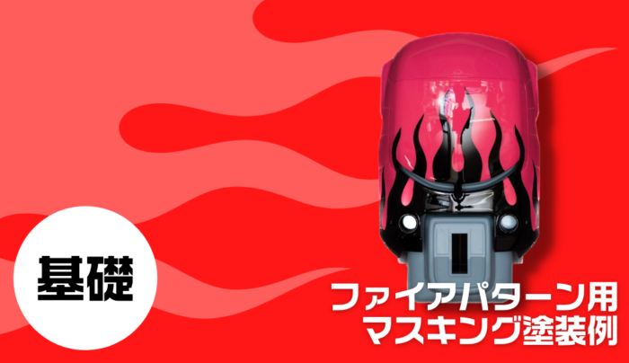 ハセガワ「20メカトロウィーゴ」を使って、ファイアーパターン用マスキング Lサイズ(PFM-116)の塗装工程を紹介しています。背中のパーツは曲面も緩やかで大きく、塗装の練習に最適です。2パーツでできていますが、模様を大きく描いてつながっているように見せたかったため、裏側で固定して1パーツのようにして塗装しています。