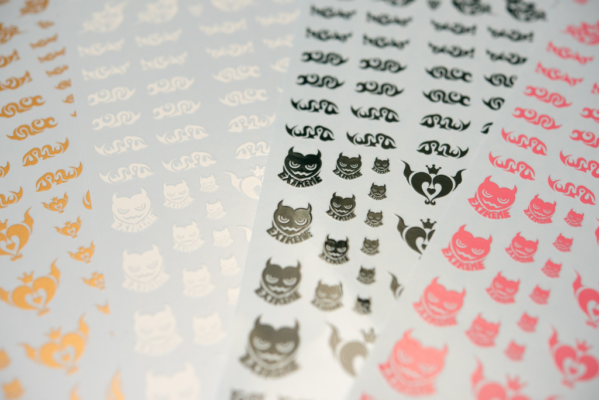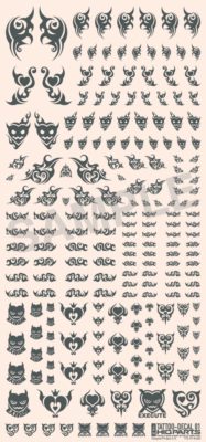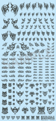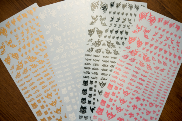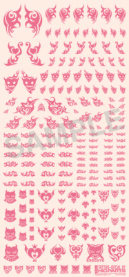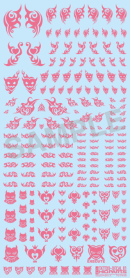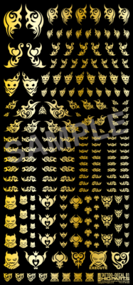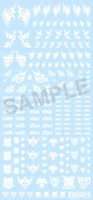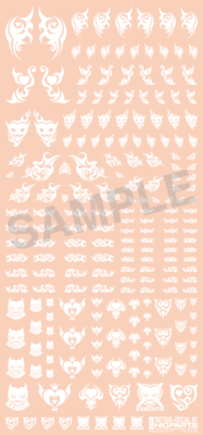 デカールサイズは1/12の素体(約13cm〜14cm)に貼り付けてフィッティングを調整していますが、フィギュアのカスタムだけに限らず1つのマークとして成立している柄もありますので、ジャンルに限らずサイズさえ合えば何のキットにでも使っていただければ幸いです。