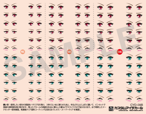 付属説明書にて初心者向けのクリアコーティングや、デカール自体の使い方なども紹介いたします。瞳は、1/12ジャストサイズと、それより10%小さいもの、10%大きい物を収録し、頭部パーツの大きさによってフィットするものを選べるようになっています。