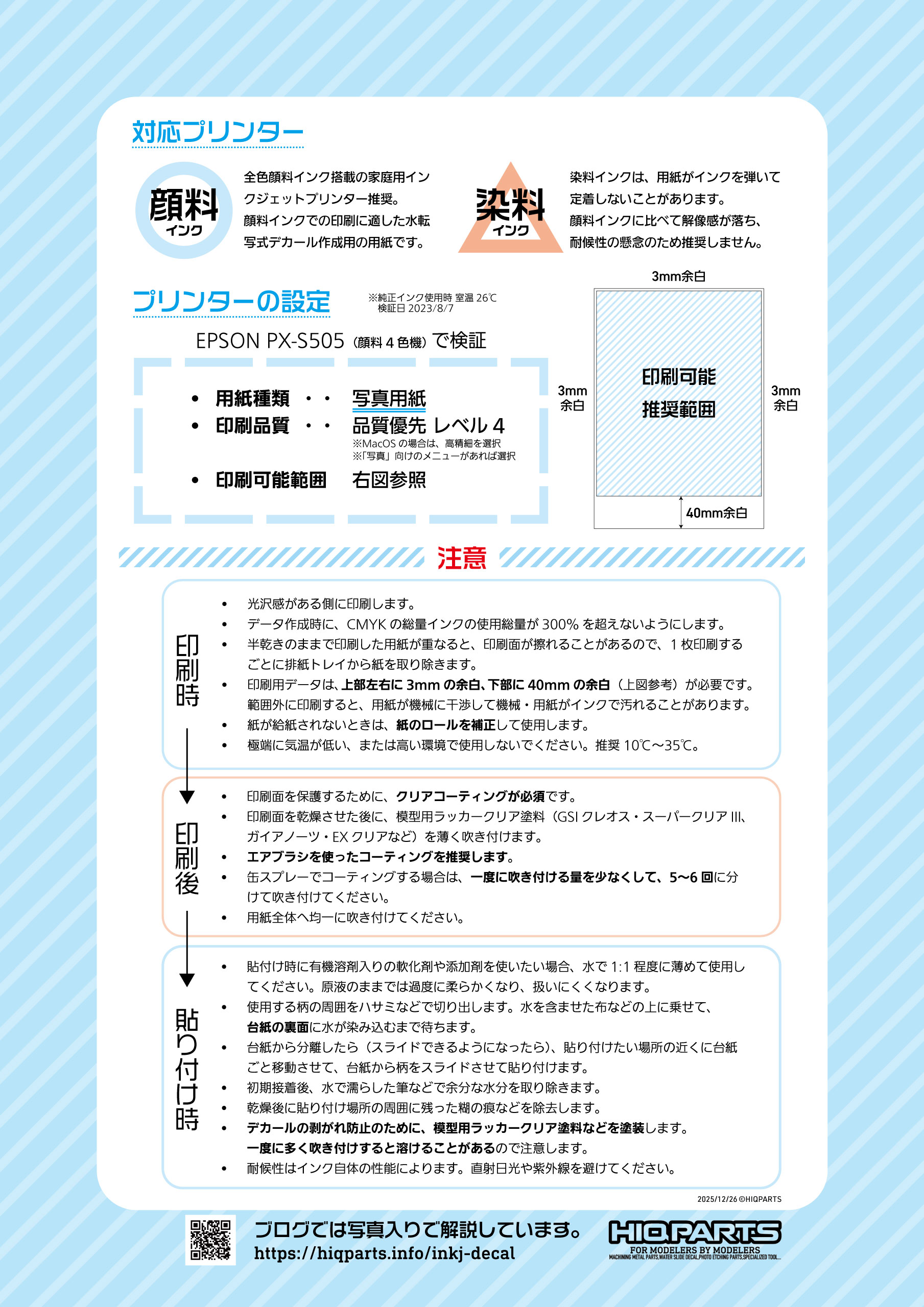 水転写式デカール自体がもともと扱いに注意が必要なものですが、家庭用インクジェットプリンターデカール用紙で自作するデカールはさらにデリケートです。乱暴に扱ったり、移動を繰り返す、水の含浸が不十分で剥離時に引っかかる、水の含浸のし過ぎで印刷が剥離するなどがおきますので、使用には修練が必要です。