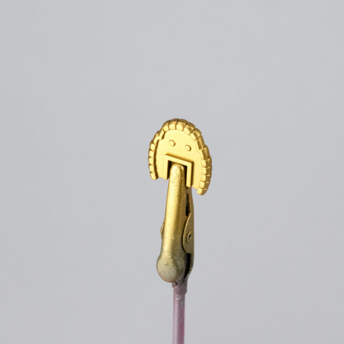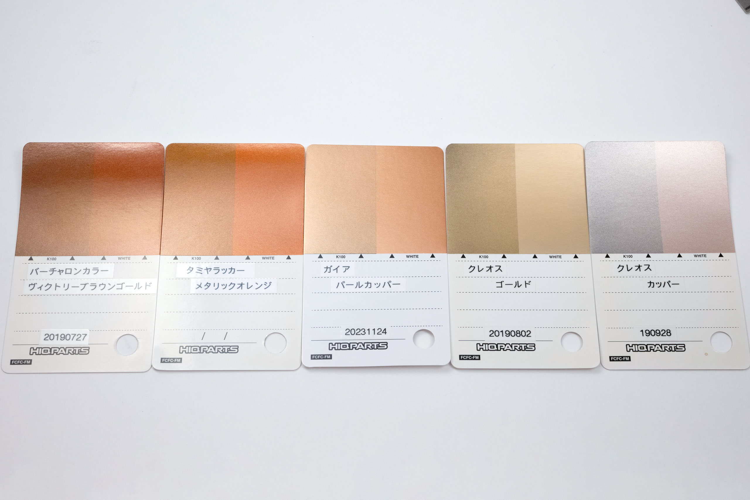 ハイキューカラーチップ メタリックカラー用(70枚1セット入)に塗装しておいた赤みのある金色を比較しています。選んだのは、黒下地のパールカッパーです。