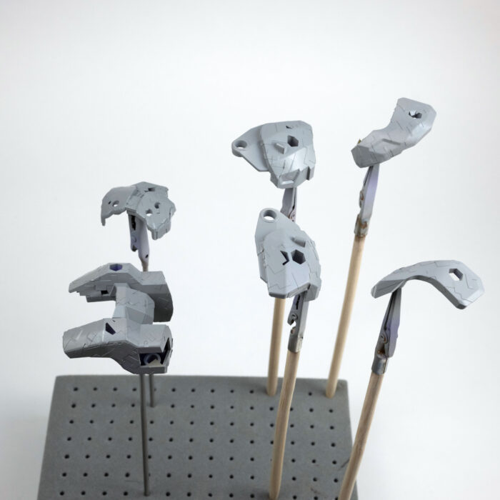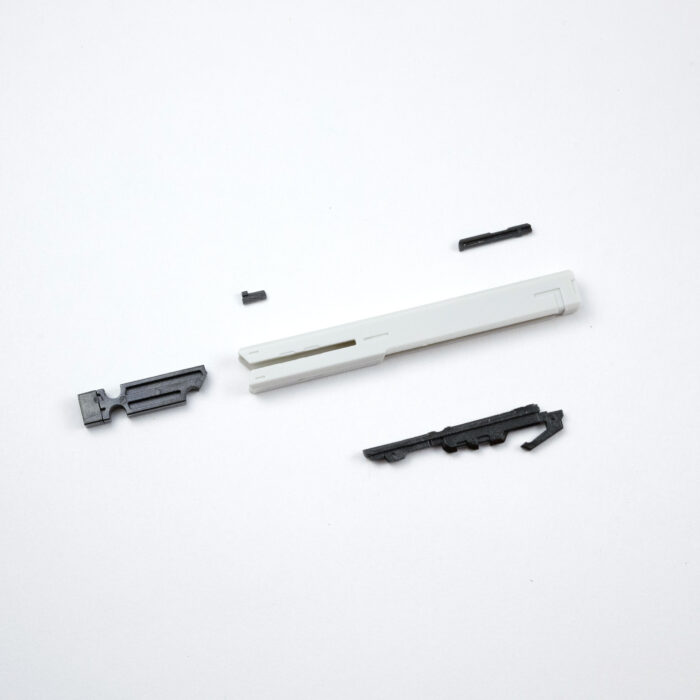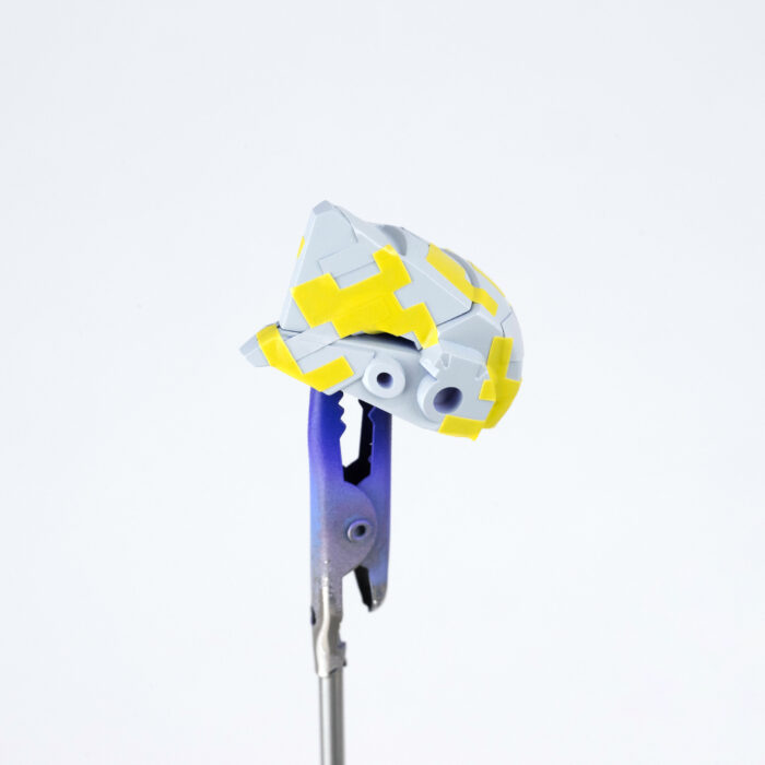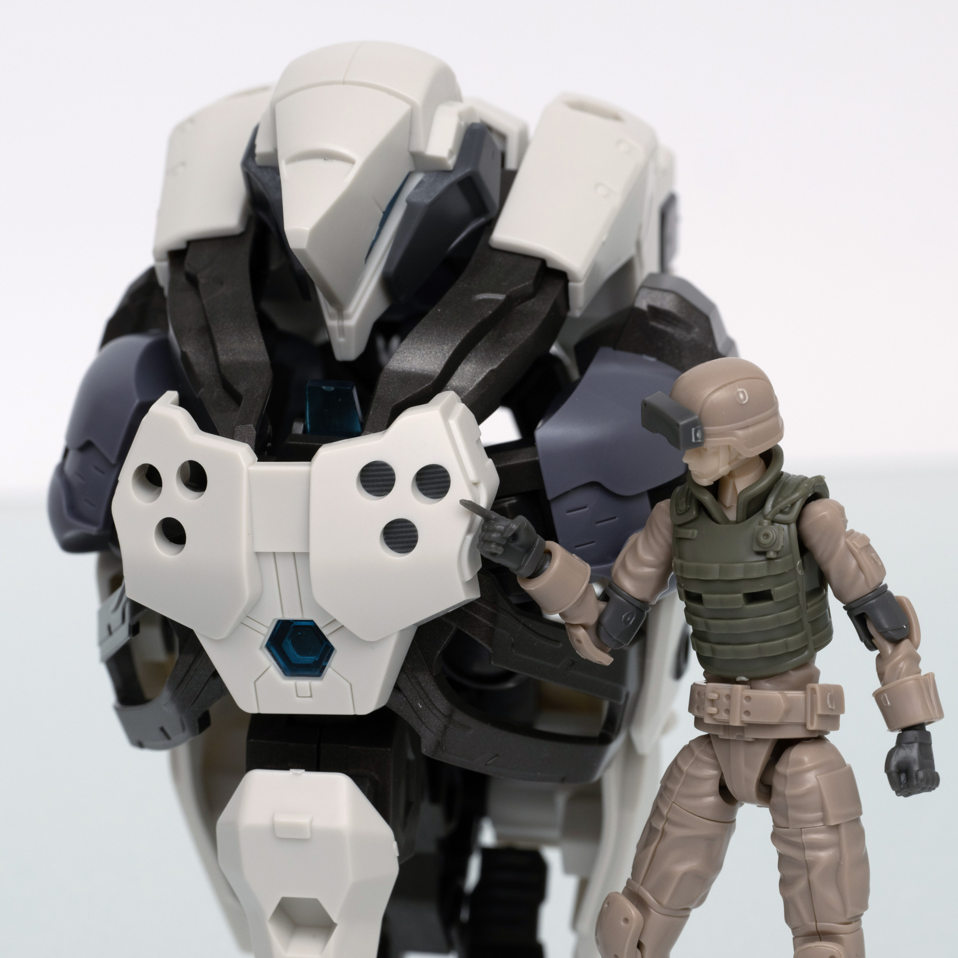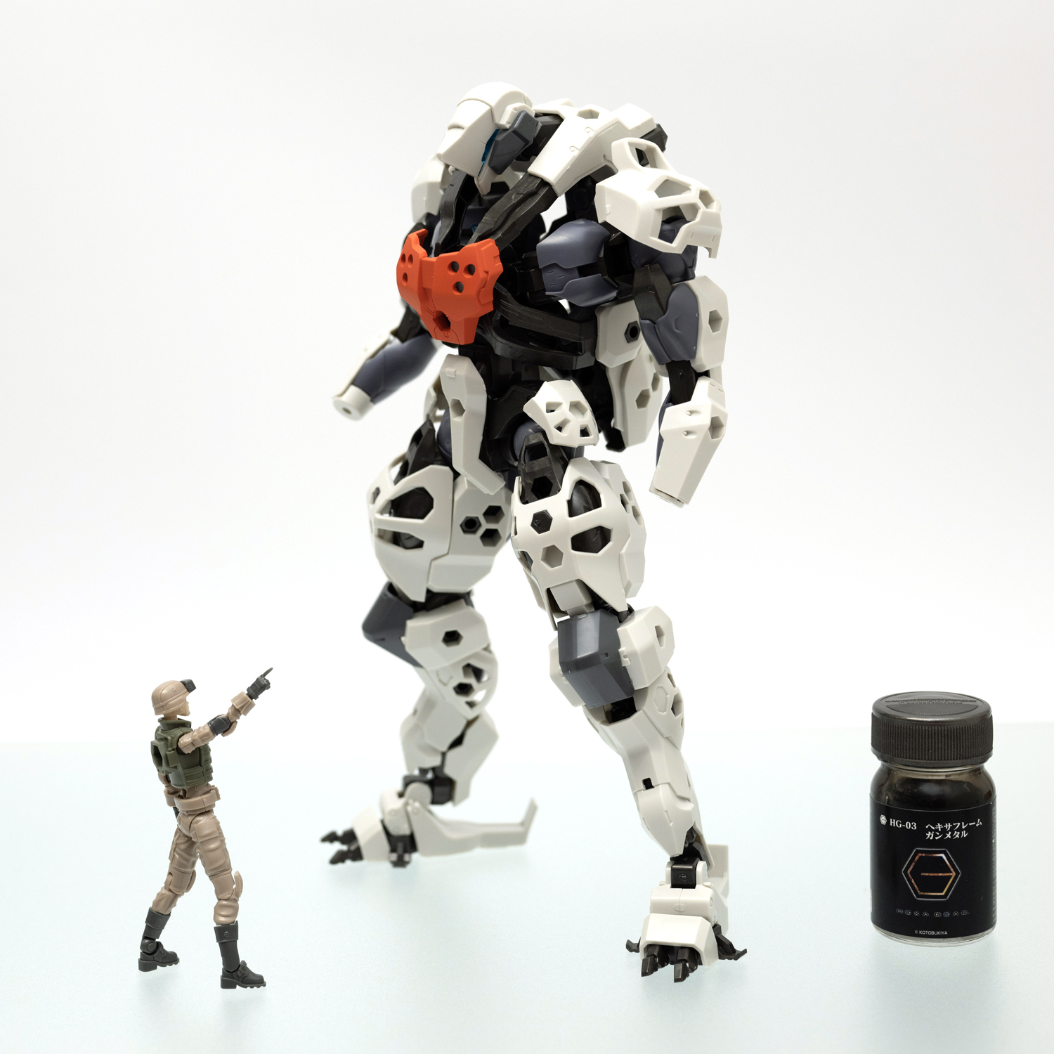 数あるヘキサギアシリーズのメカの中でも、人型に(ひとがた)近いモデルです。胸の中にガバナー(パイロット)を搭乗させることができる人型メカですが、中の人を載せなくても(あまり見えない)問題ないため、今回はガバナーなしで作成しました。キットの全高は206mmで、スケールを1:1にすると約4.9mになります。高さは現行のトヨタ「アルファード」を縦に立てた場合とほぼ同じです。