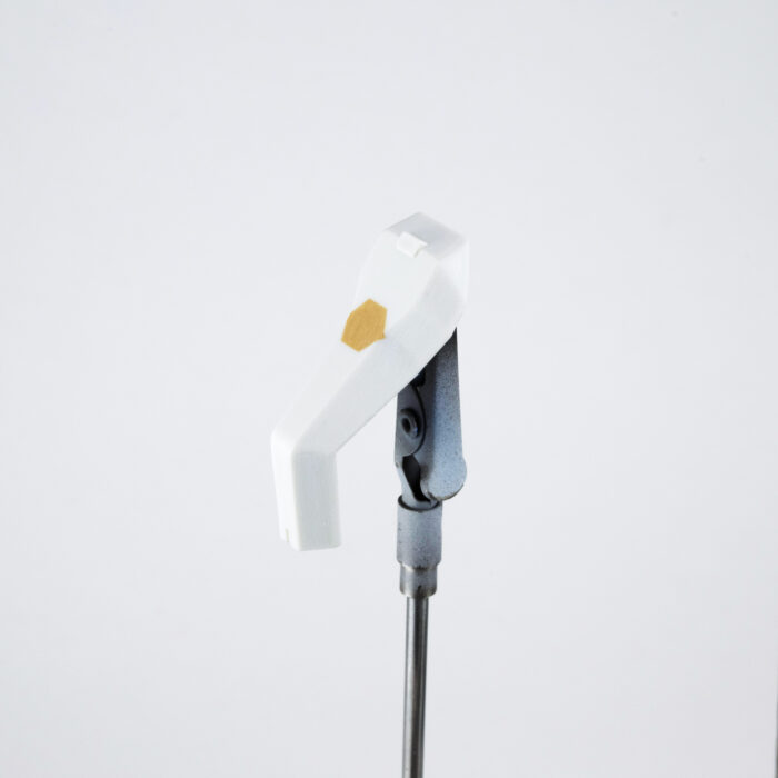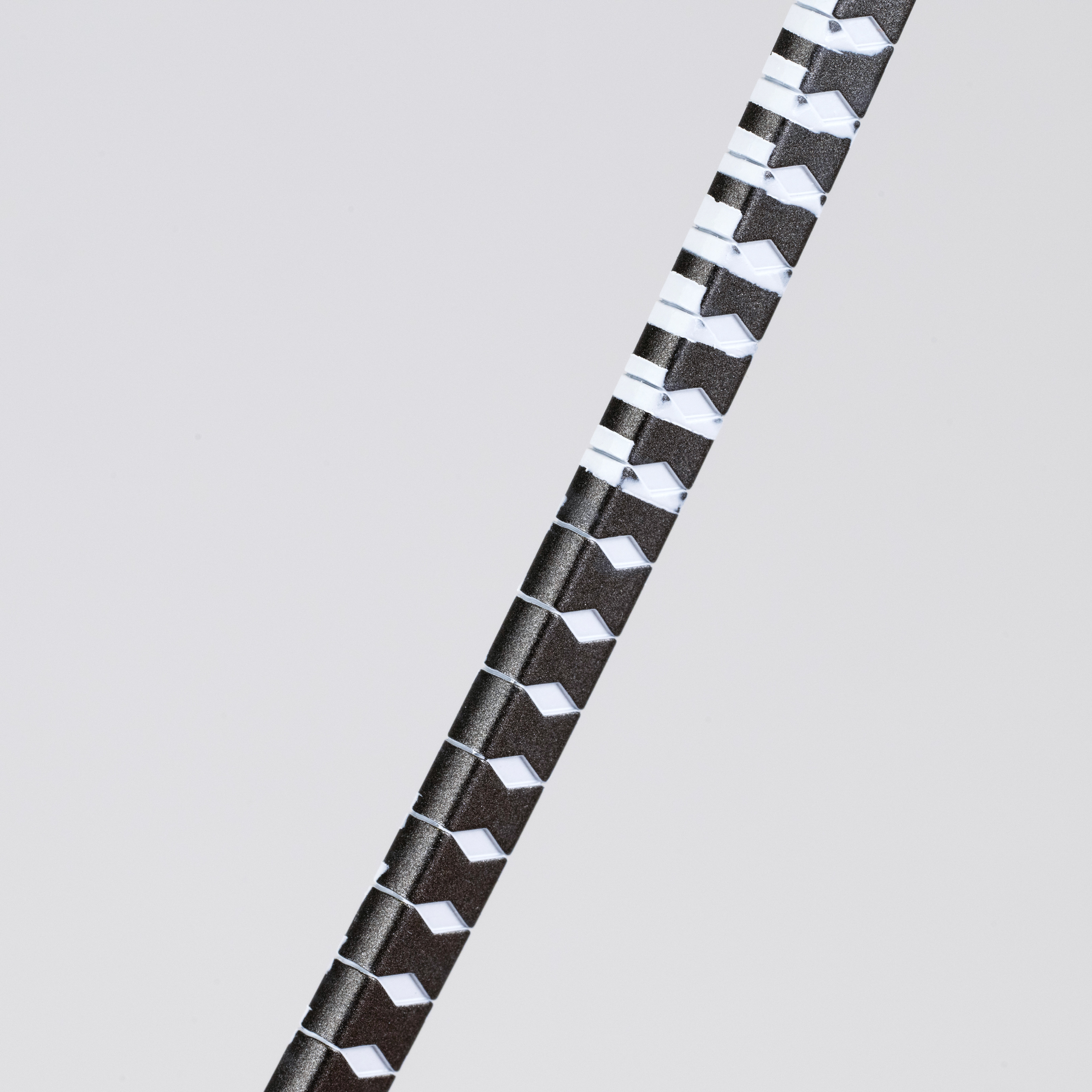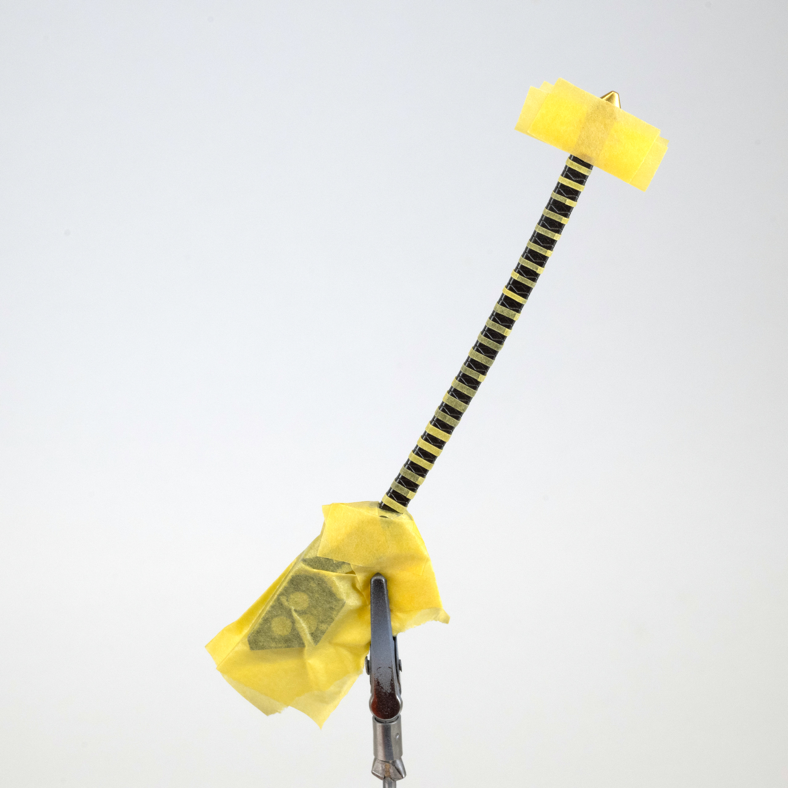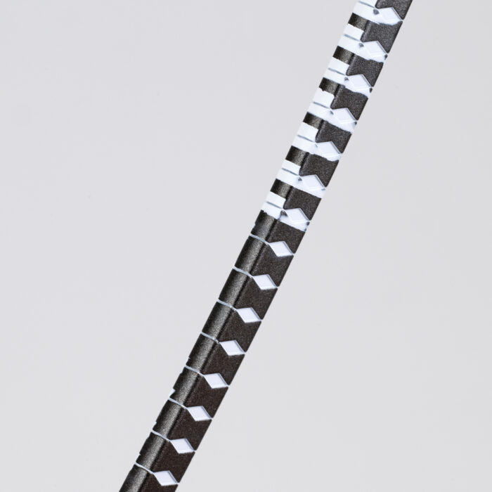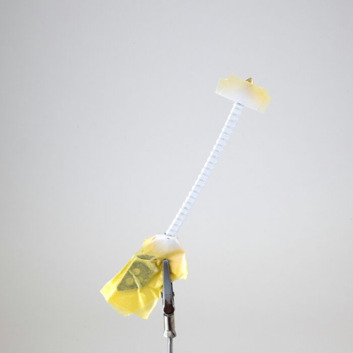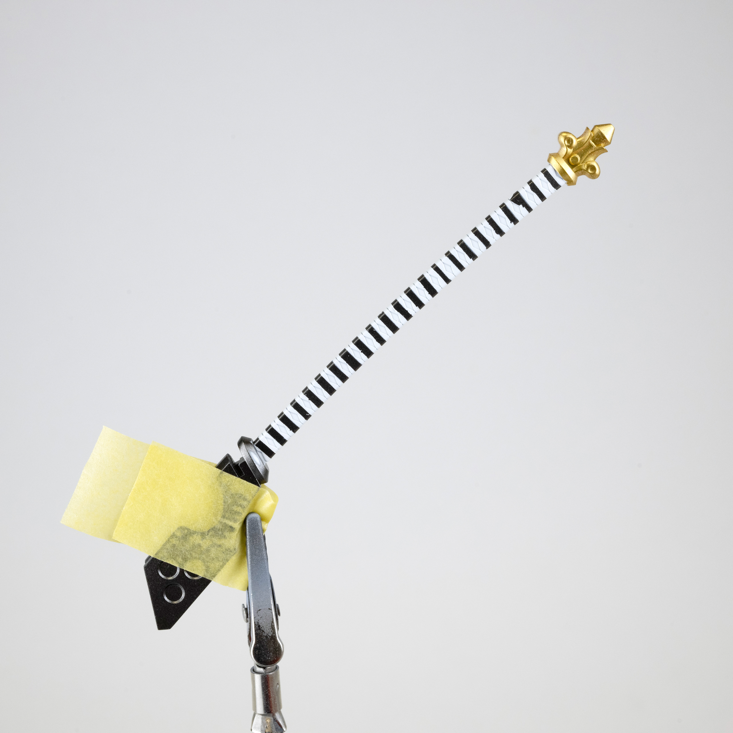 鞘の白い模様はある程度マスキングして、タミヤ「エナメル塗料ホワイト」をエアブラシ塗装。乾燥後に溶剤を軽く含ませた綿棒で拭き取りしました。塗装端面の仕上がりは、水性塗料を拭き取る方法よりも、エナメル塗料を溶剤で拭き取るほうが色のラインが綺麗になることが多いです。