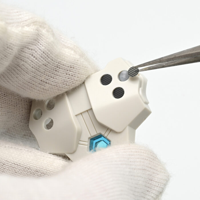 キットのままだと胸に貫通した接続用の穴が開いていたため、これを塞ぐために2DDステッカーを使用しました。