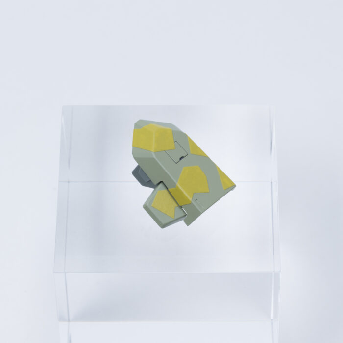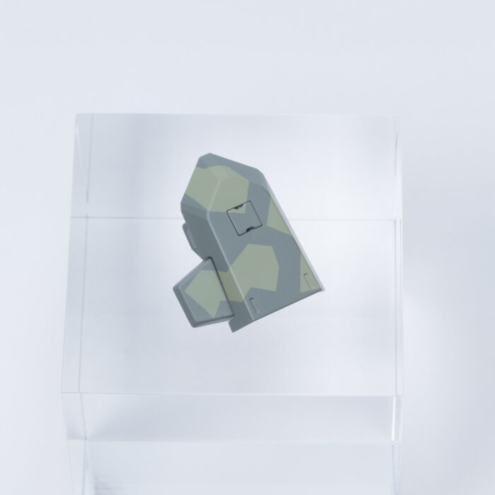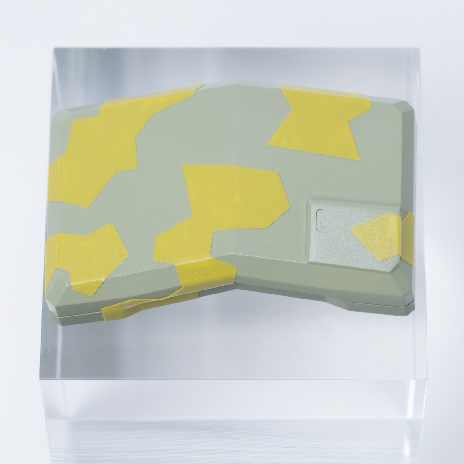 なっちんの肩のシールドパーツを塗装します。模様が定間隔で揃うと、迷彩的に格好がよくないので、周囲にはみ出すように貼ります。