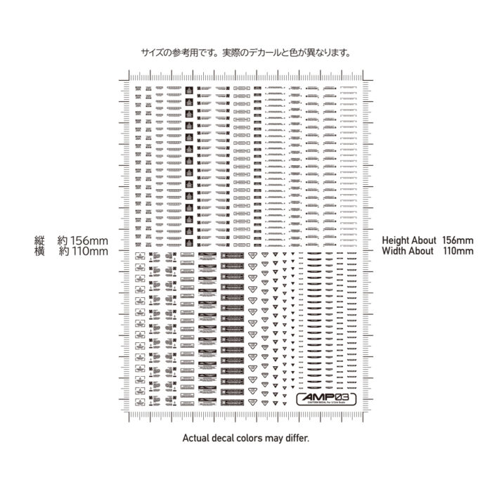 メカモデル向けの水転写式汎用コーションデカール「AMP」は、近年の細分化されたメカモデルのパーツ割に対応するため、デザインを刷新した新シリーズです。装飾を削ぎ落としたスタンダードなデザインが中心で、作品の精密感と情報量を高めます。ある程度の可読性を確保しているため、ブログの文字解説を参考に、最適な貼り付け場所を選定してください。