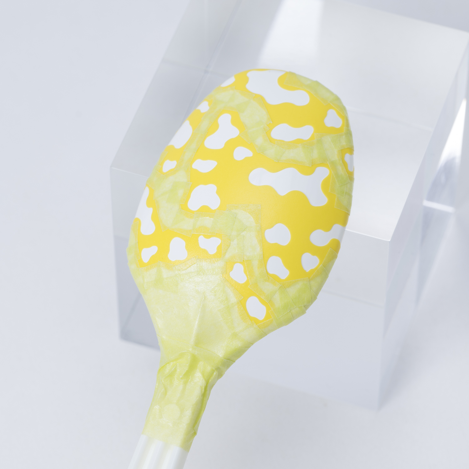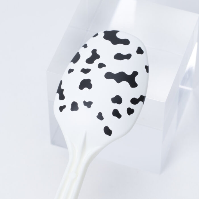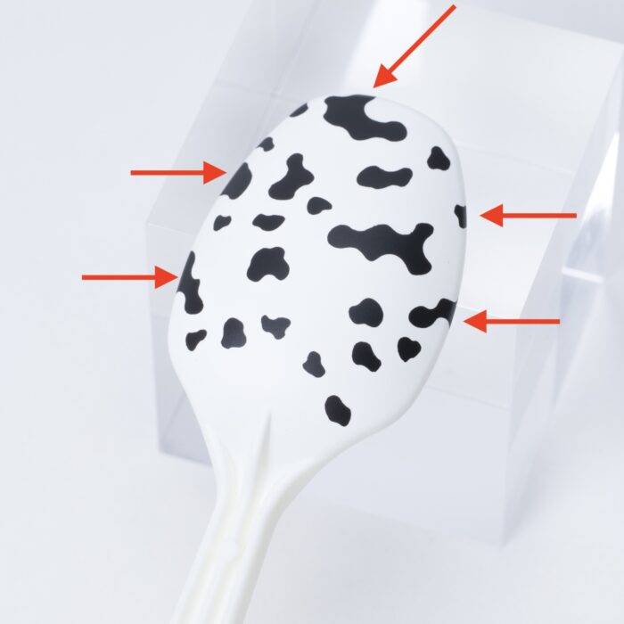 それっぽく塗装するためのポイントは、はみ出しです。このマスキングシートは、牛柄の「プリント布」を再現するものなので、末端は模様がはみ出すようにマスキングすると、それっぽくできます。