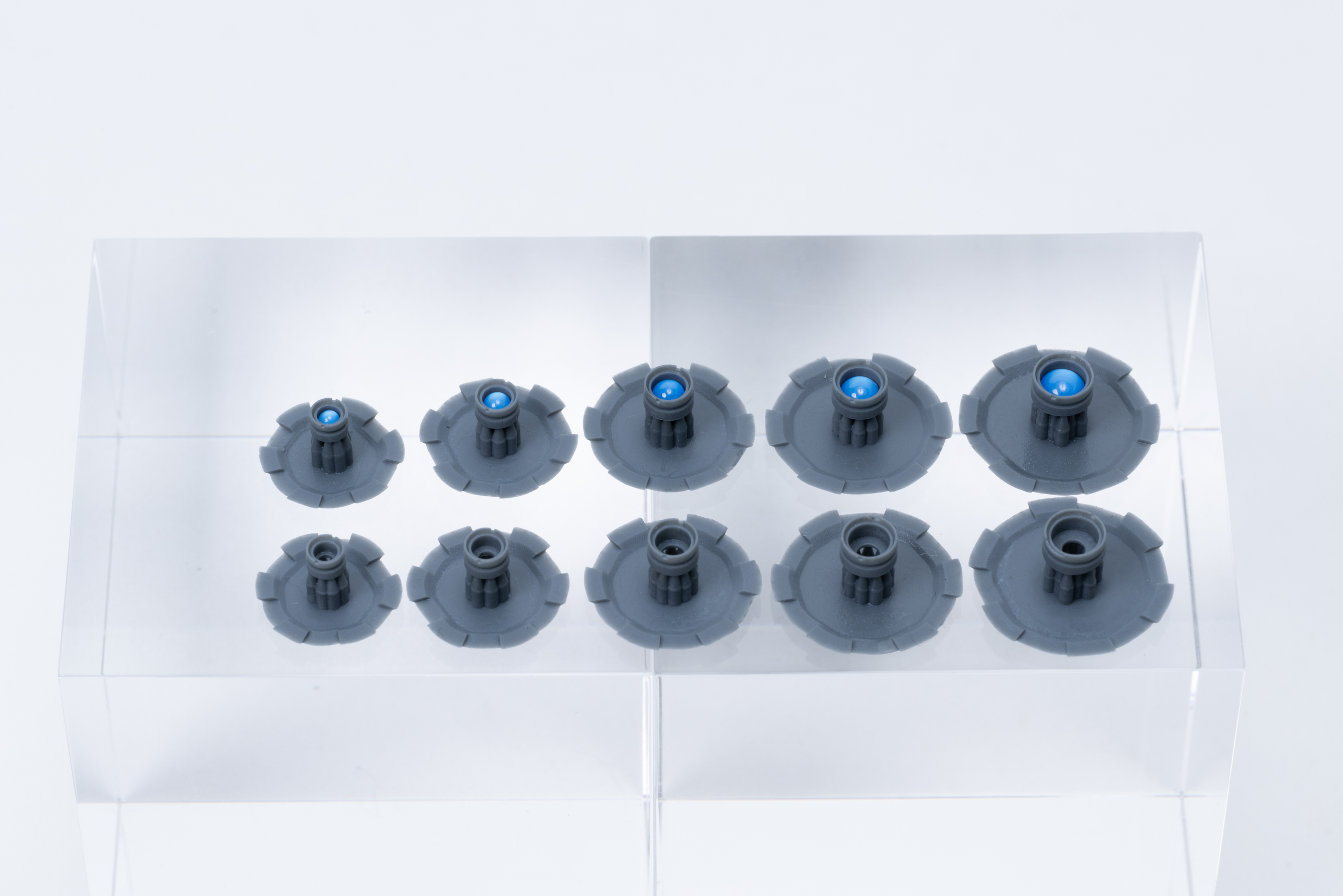 また、今回は縁の厚みを加工限界(輸送も考慮して)まで薄くしました。3Dプリンターの民生化が進み、家庭でも手軽にいろいろな印刷ができるようになりましたので、旋盤加工品の利点がより生かせるような設計にしています。90度で切り替わる端面や、先端部の薄さ、真円度など、精密な加工の組み合わせが生きたパーツです。