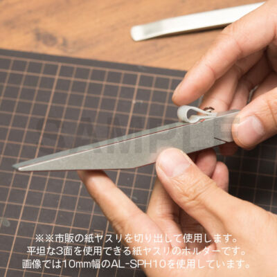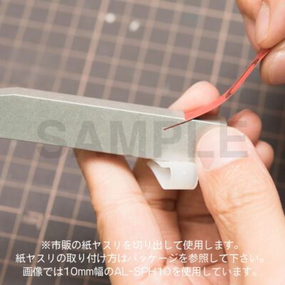市販の紙ヤスリを2cm幅、約23cmに切り出し、アルミ材に取り付けて使用します。取り付け方はパッケージまたはブログを参照してください。アルミ製なので剛性感があり、模型の面出しなどに特に役立つツールです。先が細くなった形状で狭い箇所のヤスリがけも可能。粘着剤を使わないのでアルミの平面をダイレクトに使って面出し可能です。伸縮性のある紙・布ヤスリ(コバックス社フレックスクロスなど)は使用できません。紙ヤスリは市販のものを使用してください。約230mmの定尺のものが使用できます。側面・後端に貼り付ける番手シールが付属します。