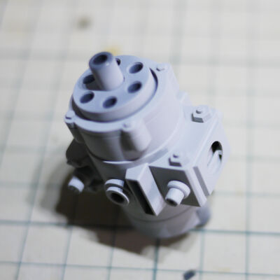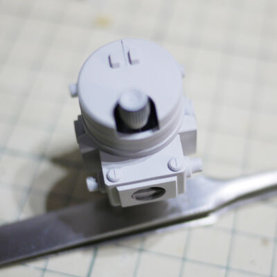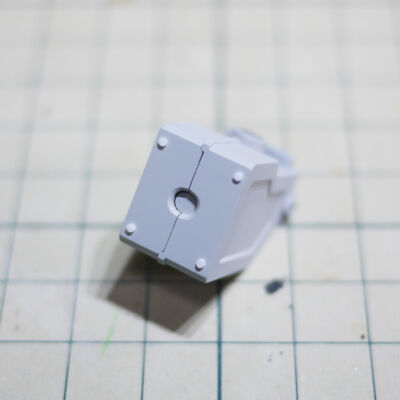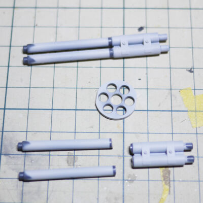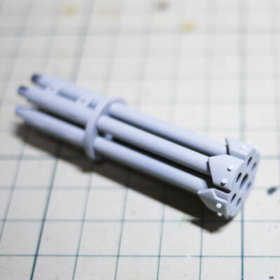 砲身を束ねている部分のディテールについて。パーティングラインの処理の都合で切り落としてから1mmのプラ棒で再生。弾倉の底のディテールも同様です。本体下部の前後、ボルトとナット部分も同様に、MSGの六角ナットと丸モールドで再生。グリップのフレーム先端部分も同様に、六角ナットで再生しました。
