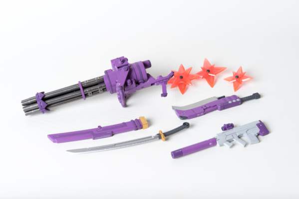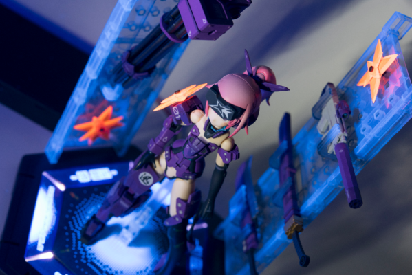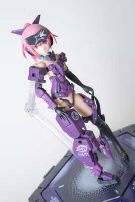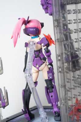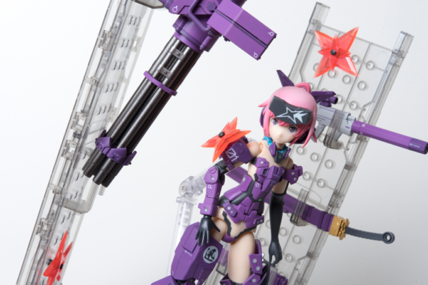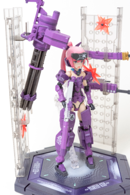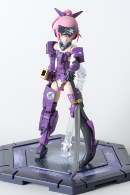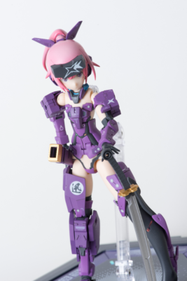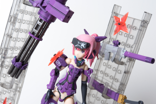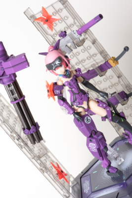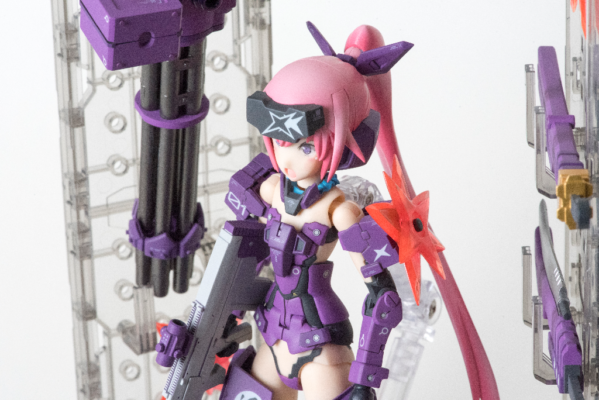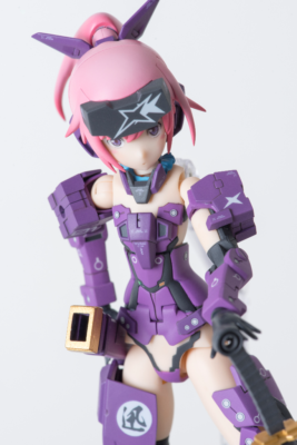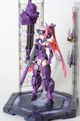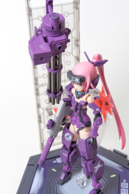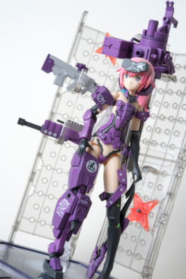 今回はコトブキヤより発売中のフレームアームズ・ガール「迅雷」のカスタム例です。『迅雷 紫』と題して、紫の装甲にピンクグラデデーションの髪。銃火器類も同じカラーで統一しました。