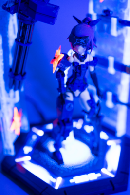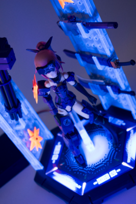 本体はキットを活かして塗装・作成しています。ガトリングガンについては後述。セッションベースは電飾と、ブラックライトで光る蛍光白トナーを使ったデカールを使用しました。本体は長崎さとるが担当。電飾・配色・デカール類をハイキューパーツで担当しました。