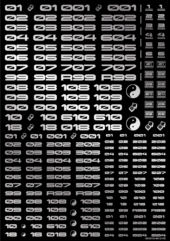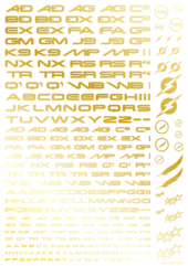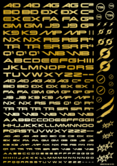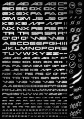 SFメカモデルのマーキングとして好評のTRデカールに追加カラー2色。スタイリッシュな横長書体は継承し、ナンバーに加えてアルファベットを追加。昨今の小サイズ模型パーツにもフィットしやすいサイズに変更し、シンボルマークも数種追加されています。印刷はシルクスクリーン印刷で、色濃い印刷が特長です。アルファベット版の羅列文字の一部は、ハサミなどで切り離しが必要です。詳細はパッケージをご確認ください。
