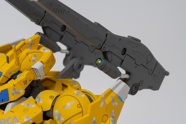 フレームアームズの白虎に、新商品「ピクセル迷彩デカール2クールグレー」を使用。レーザーライフルは2丁とも背中に背負わせてダブルキャノン仕様にしました。手首はノーマルハンド・ネオに交換。