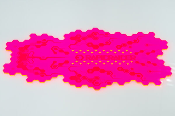 今回はデカール用に作ったデータをもとに、ハーフトーン風のデータ+グレースケールに変換して機械に送っています。蛍光アクリルの場合に顕著ですが、カット面と彫刻面、何もしていない素の面で色が違って見えますので、意識しながら形を決めていきます。外周のカットラインが六角になっているのは光を意識してのものです。