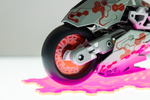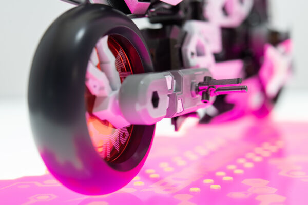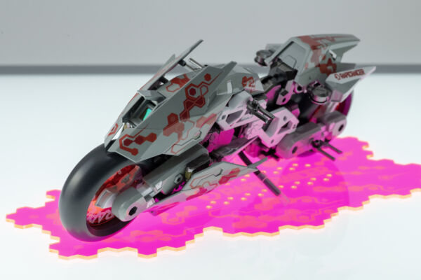 一部の写真にはトレース台を敷いて撮影しています。発光する背景の影響で被写体が露出不足気味になるので、カメラの露出補正を+にすると、撮影後の画面プレビューで具合を確認しながら撮影できます。真下から面光源で照らせます。手軽にSF感(光る床のような表現)を出せる追加照明です。